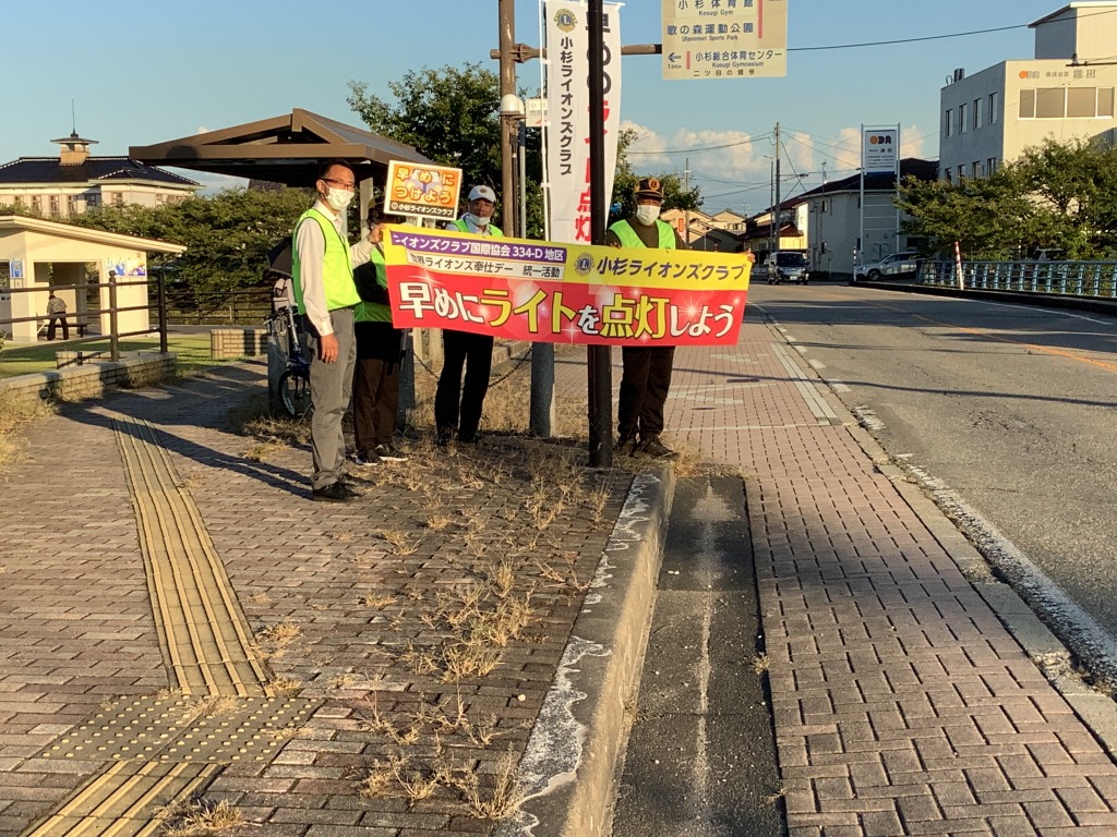 2R2Zでは各クラブで実施しようという事で、小杉ライオンズクラブでは担当委員会と協力委員会20名で小杉駅前の県道沿いの下条川橋の両サイドで実施しました。早めのライトアップを呼びかける為に16時15分から開始した為、初めは明るくライトアップする車は少なかったが、5時過ぎからはライトを点灯して下さるドライバーの方も増え予定時間を延長して実施しました。ボードの他に横断幕も作りましたが、もっと大きいサイズのものでもよかったように思います。のぼり旗はとても目立って良かったです。今回の活動は、ボードやのぼり旗で呼びかけるものでしたが、ドライバーの方々が点灯して下さるのを見てこの奉仕活動の大切さを感じました。