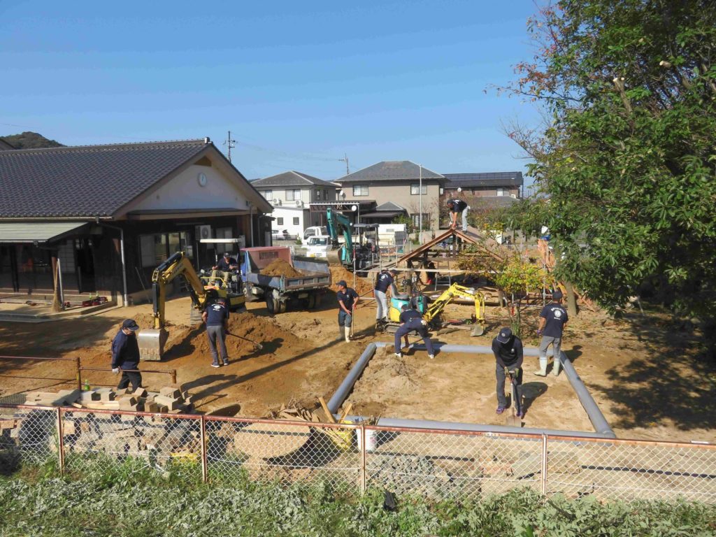 11月3、4日と二日間に渡り、敷地内の土の入れ替え、粘土遊び場の移設、既存の小屋屋根張替え、築山形成、園庭裏の土手に階段を新設、樹木の伐採・剪定、草刈りを行った。
