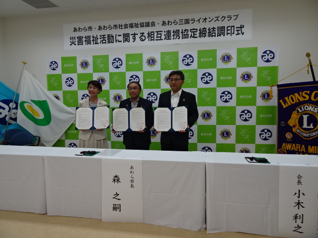 この協定を機に災害時の積極的な支援活動が行う方針などが示され あわら市・あわら市社会福祉協議会・あわら三国ライオンズクラブの三者による災害福祉活動に関する相互連携協定の提案がなされ締結の運びとなりました。
