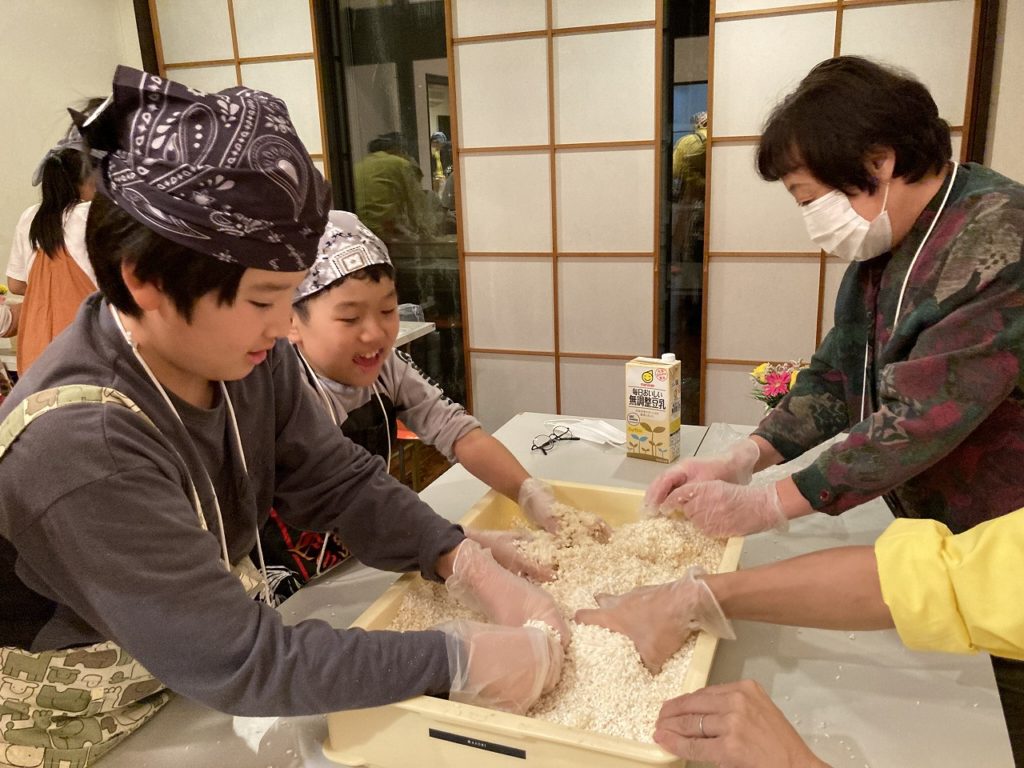砺波市の生活支援家庭の学習支援「こみんか塾」の子どもたちと味噌づくりを通して日本の食の歴史と先人たちの知恵を子どもたちと共に学ぼうと『みそづくり体験交流会』を開きました。