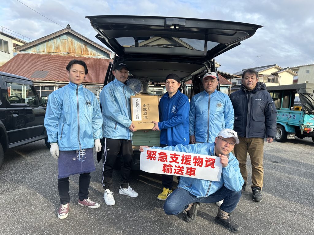 不足している物資の情報を聞き 気分転換用の娯楽道具をメンバーからのドネーションを資金にして被災地へ搬送させていただきました。また魚津市内企業・メンバーから提供いただいた食品、魚津酒造様から提供いただいた日本酒30升を 輪島市に搬送いたしました
