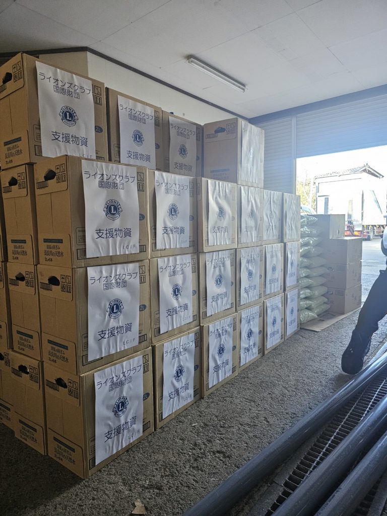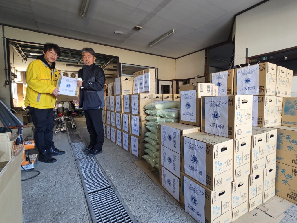 LC国際協会334-D地区キャビネット事務局宛に2024/2/初旬頃、334-D地区3R3Z輪島ライオンズクラブ : 会長 L.小森紀史から 一本の電話が入ります。「輪島市は未だ水道復旧がされず「断水」の状況があります。行政担当者からの復旧予定を聞くと 「2024/3/末を目処に通水を予定」と聞いてますが、未だ水・物資等が足りてない状況があります。」というお話を頂き 輪島市内の現況調査に出向くと、輪島市中心部内の一部は2月中旬から一部通水となっていますが、被災場所によっては 通水がされていませんでした。2024/2/27日の正午過ぎに,輪島市内にある物資備蓄倉庫(L.小森会長の事業所)に、ペットボトル 水(2ℓ×6本入)100ケースと無洗米10キロ✖️150袋を届けました。 出迎え時に小森会長から「本当にありがとう。これで当面、水と食料に困らない。この水と米は早急にクラブメンバーから被災 地域に配らさせて頂きます」と力強いお言葉を受け、自らも被災しているにも拘らず、地域の為に尽力されるL.小森会長並びに クラブメンバーの方々にも少しでも地域の為に頑張って頂きたいと思います。