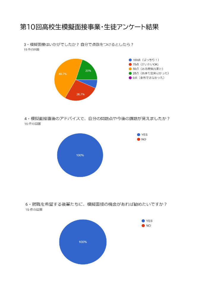 «結果» 面接終了後の、アンケート結果によると全員が緊張をして面接に臨んだことがわかりました。また「面接官からのアドバイスで、自分の問題点や今後の課題が見えた」「後輩たちにもこの模擬面接は勧める」との回答を全員から得ることができました。彼らの今後に役立つ事業となったことは間違いないと思います。健闘を祈るばかりです。