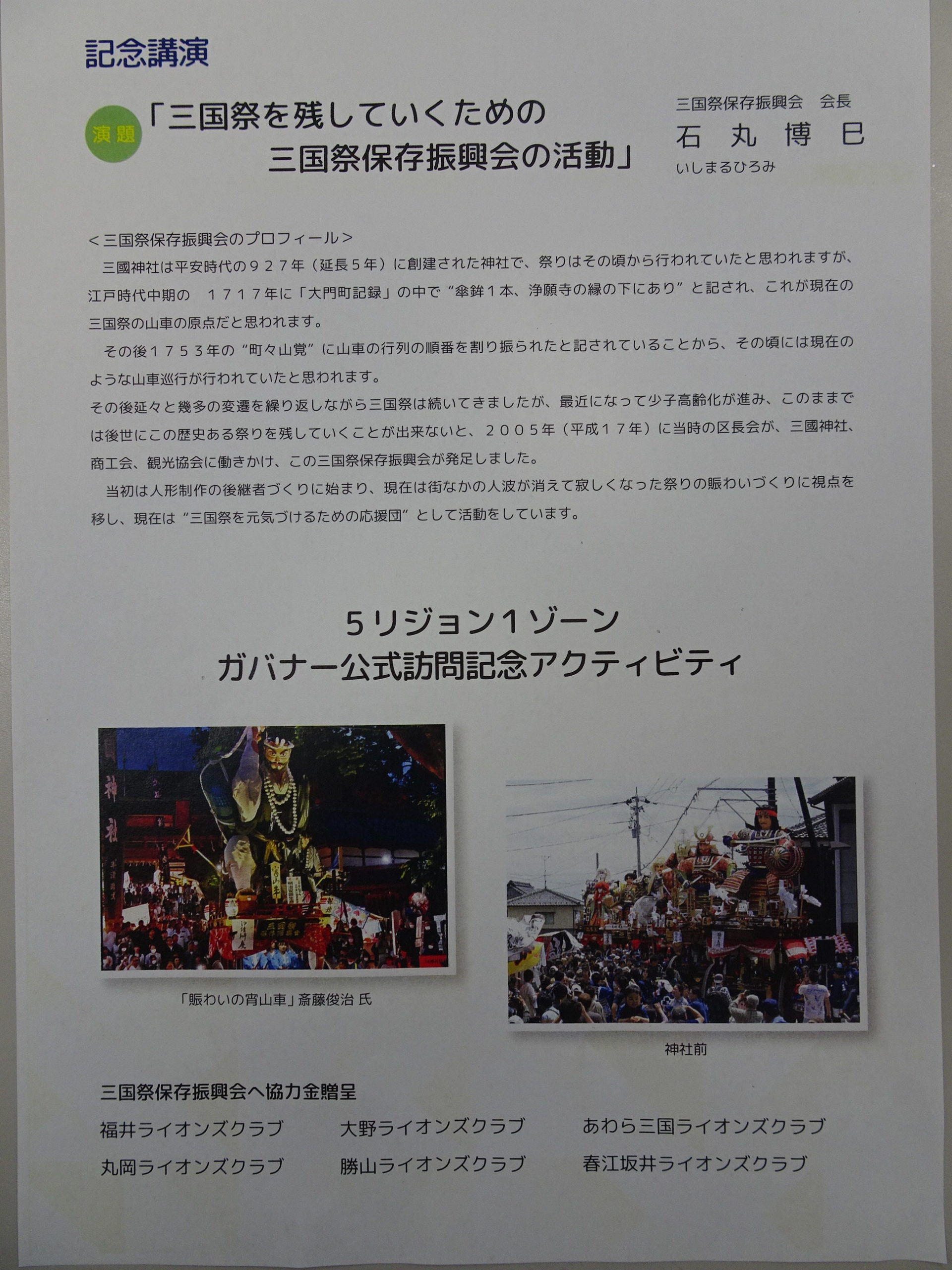 地区ガバナー クラブ公式訪問にて、5R1Z合同アクティビティ(福井LC 大野LC あわら三国LC 丸岡LC 勝山LC 春江坂井LC)地域が求める奉仕活動の一環として福井県坂井市三国町の平安時代から行われていた三国祭を今後も是非継続してほしい。との願いから三国祭保存振興会へ協力金を贈呈しました。