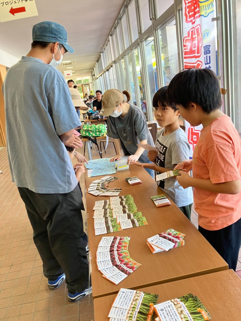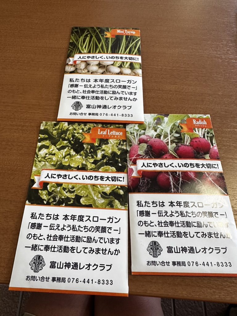 富山神通レオクラブのブースでは「助け合おう つないでいこう いのちのバトン」の今年のテーマのもと【美味しい野菜を育てよう!】というタイトルを掲げ、来場者に500袋の野菜の種を無料配布しました。