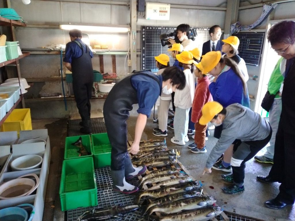 熊野小学校4年生が神通川サケ増殖場を訪れ、富山漁協の組合員から増殖場の役割について、卵から ふ化した稚魚を体長約5㎝ほどの稚魚にまで成長させてから神通川水系の河川に放流すると説明されました。