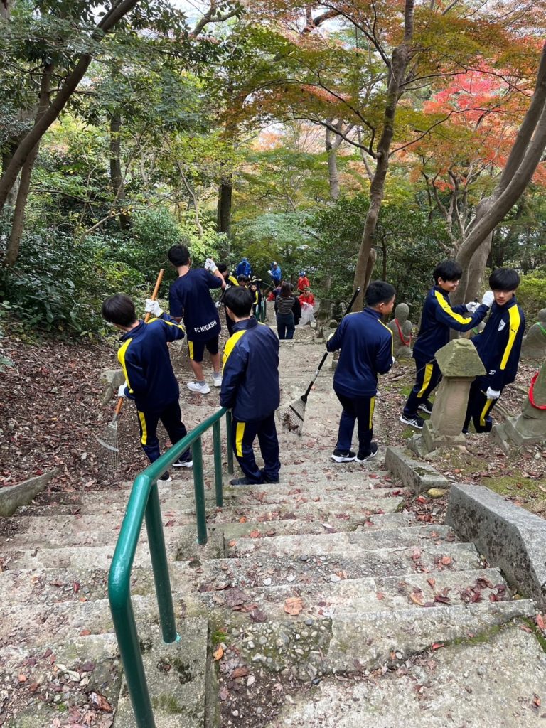 ブロアー、レーキ、竹ほうき等使い五百羅漢がある山頂から階段、遊歩道にある落ち葉を集め落ち葉を山に戻す(堆肥として)作業を、神通ライオンズ、神通レオクラブメンバーら計40名で行い、長慶寺・五百羅漢周辺をきれいに清掃しました。