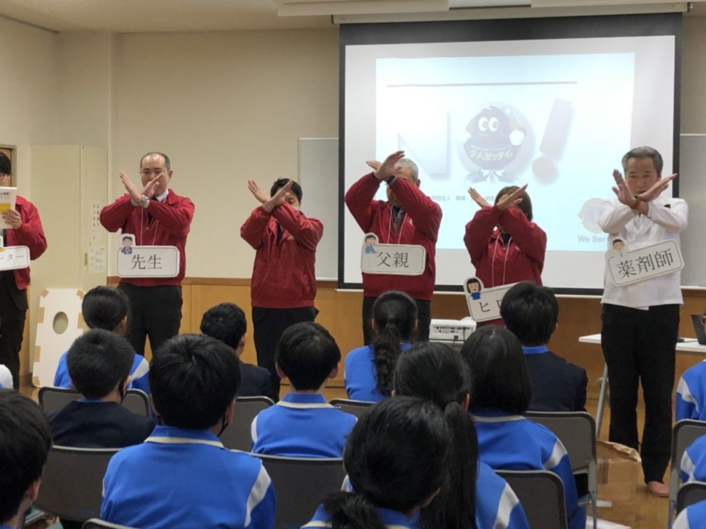 「ライオンズ劇団の寸劇では、市販の薬でもいっきに飲んではいけないということをわかりやすく、おもしろく理解することができました。」「薬物乱用の誘いがあっても勇気を持ってきっぱりと断ることが大切だと学びました。」「薬物乱用は自分の身近なところにあることがこの学習をとおしてわかりました。」「たばこやお酒が薬物乱用の入り口であることを学び、身近にもたばこやお酒を飲んでいる人がいるので教えてあげたいです。」「寸劇ではおもしろさもふくめながら、しっかりと薬物の恐ろしさを伝えているのが上手だと思いました。(生徒さんの感想から)
