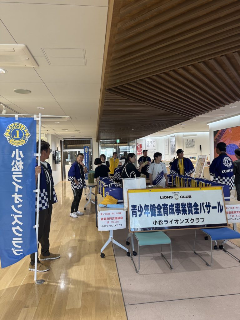 小松ライオンズクラブでは、未来ある青少年の健全育成を目的として、育成事業資金獲得のためにチャリティバザーを開催していましたが、昨年より能登震災復興支援の事業として、輪島ライオンズクラブを通して、能登の事業者から食品や工芸品を購し、