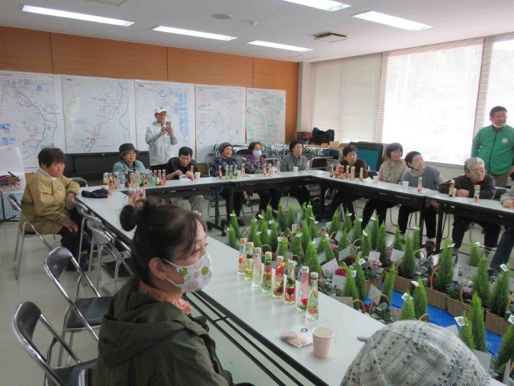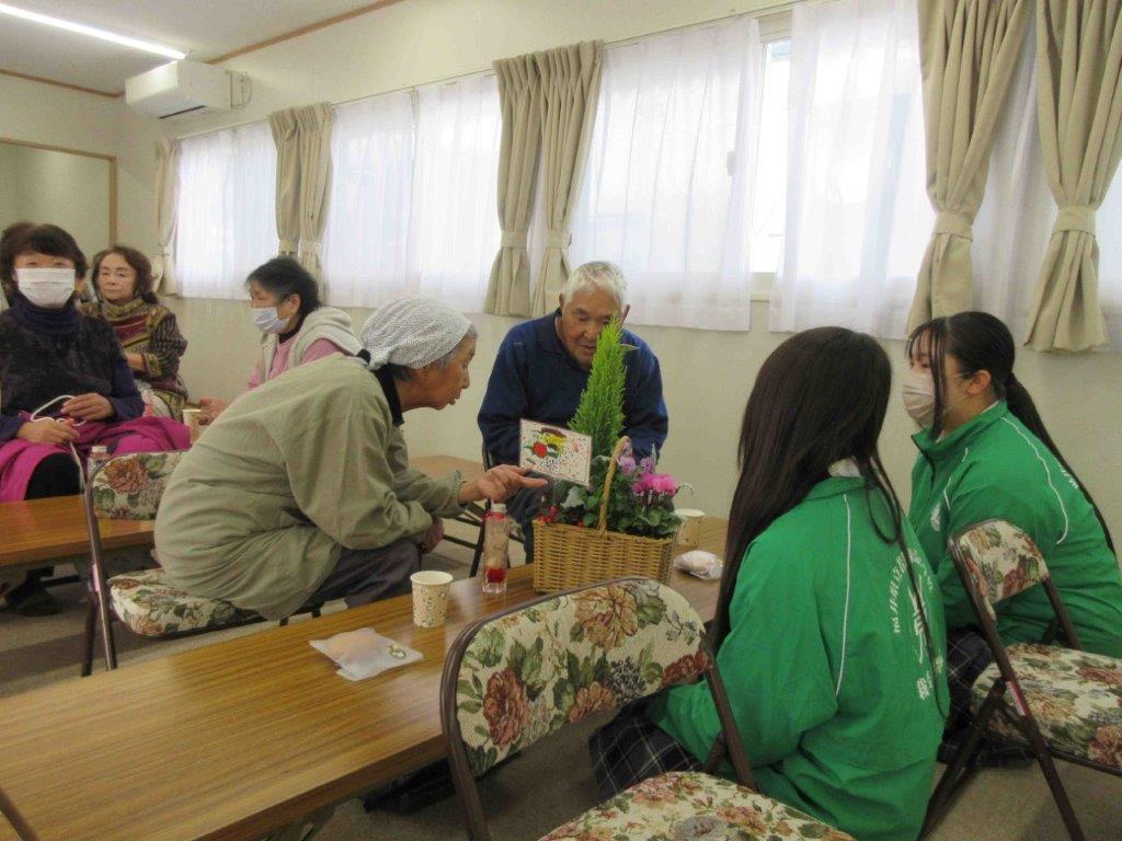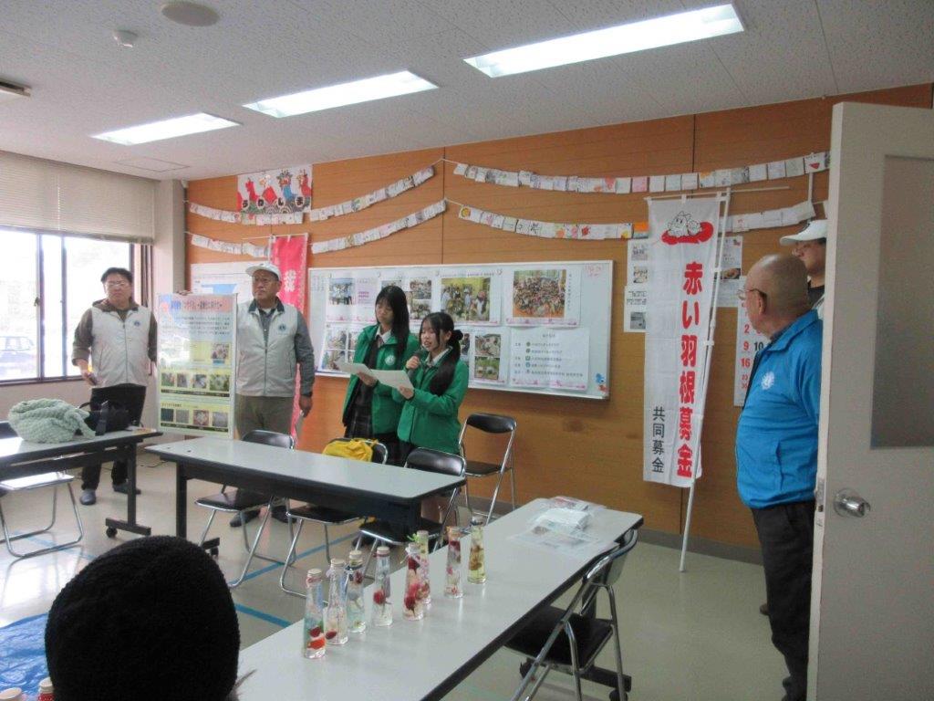 11月23日(日)小浜LCと若狭西LCの合同事業である能登半島支援事業を実施するため、朝7:00小浜商工会議所を小浜LC 9名・若狭西LC 3名・小浜市社会福祉協議会から2名・若狭東高校先生2名・栽培研究部1年女性生徒4名、 ハイエースバン、1tトラックに寄せ植え・ハーバリュウム、湯沸かしセット、クッキー、お茶振舞道具等積み込み出発しました。輪島の今回目的地である御陣所太鼓発祥の地近くの小学校グランドと公民館前広場に建てられた第一、第二、里町仮設住宅に到着。すぐに会場準備開始・会場内椅子、テーブルを並べる、持って行ったマイクをセット、お茶等の準備で菊のお茶を煎じ、準備した写真、チラシ等を貼る、花盛籠をブルーシートの上に並べ、ハーバリュウムはテーブルに並べる等の準備完了後13:40より2会場に分かれ、各ライオンズクラブ会長より挨拶、説明の後、クッキーを配り、紙コップ等でお茶を配り交流会開始、その後、寄せ植え、ハーバリュウム150個の贈呈式を開始しました。高校生の栽培したコウギクを使ったお茶とクッキーを振舞いながら、自己紹介、写真を使い今までの実施事業報告、高校生による活動報告、自己紹介をした後、各自が被災者の皆様一人一人と直接会話を交わしての交流をしました。話しを聞く中、70,80,90代のお年寄りの一人住まいが多いことに気づきました。被災者の皆さんの方は、内心はこれからのことを考えると、不安でいっぱいでしょうが、支援者に対して明るく、気さくに対応していただけました。寄せ植え、ハーバリュウム贈呈式の後、被災者代表の区長会長様より謝辞をいただき、被災者の皆さんの温かいお見送りを受ける中、お互い手を振り合いながら帰路に着きました。後日 ありがとうのお礼状が届きました。
