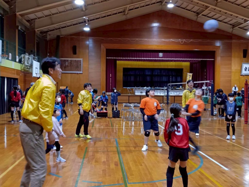 毎年開催していますが、今回から低学年の部(フレンドリーの部)に、クラブ員もチームに混ざり、一緒にソフトバレーをしました。