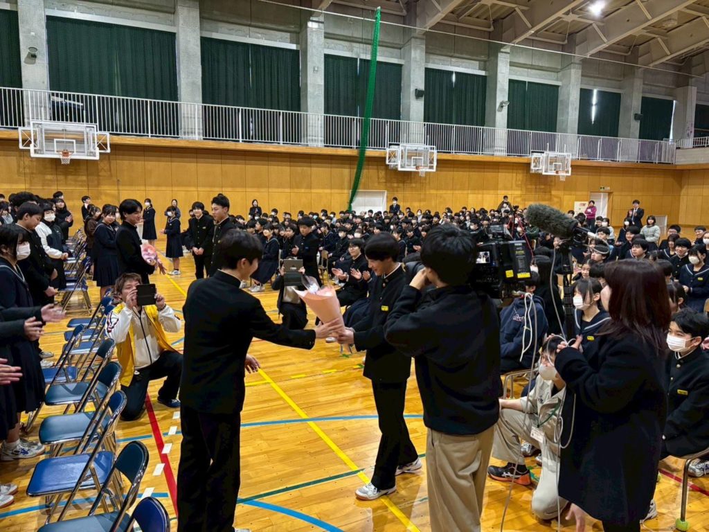 森田中学校の卒業生を送る会に合わせ、同校2年生が不要となった布を再利用し手作りの花束を制作しました。卒業を迎える3年生へ感謝と応援の気持ちを込めて贈呈するとともに、能登半島地震の影響により大きな環境変化の中にある輪島市の生徒達へ、同じ時代を生きる仲間としてエールを届けます。