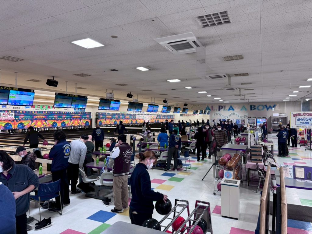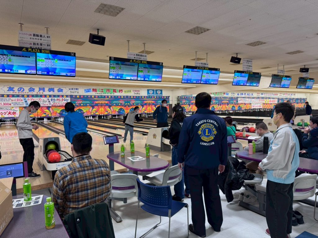 障がい者支援センター「ひまわり」利用者の方54名、職員9名、計63名を招き、鯖江市アルプラザボウルにて、会員との親善ボウリング大会を開催。79名にて3~4名の混成24チームが2ゲームを投球。ボウリングはせずとも、運営協力の会員21名と共に、100名で、ボウリングや応援を楽しみいいプレイの後はハイタッチをするなど、2時間に渡って楽しい交流のひとときをすごした。